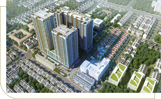 Trên tổng diện tích đất 38,609 m2, diện tích công trình nhà ở cao tầng, công trình trường học, nhà trẻ, cây xanh và hạ tầng kỹ thuật được tính toán, phân chia hợp lý